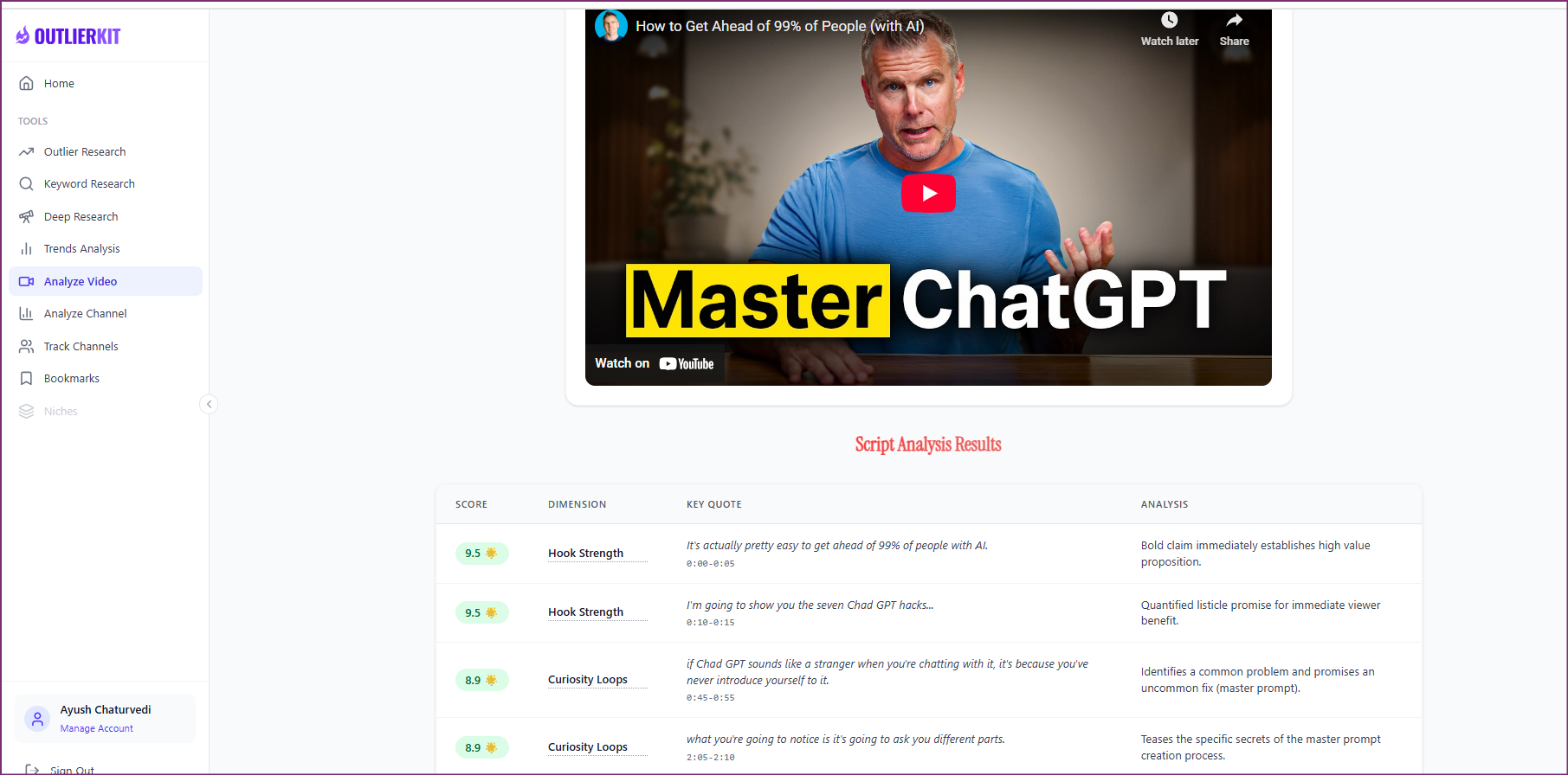 OutlierKit Video AnalyzerBefore you repurpose anything, you need to know which videos are actually worth repurposing. Use OutlierKit's Video Analyzer to audit your channel and identify the videos with the highest retention, engagement, and view velocity. These are the videos that already proved they resonate — repurposing them multiplies proven winners instead of gambling on unproven content.